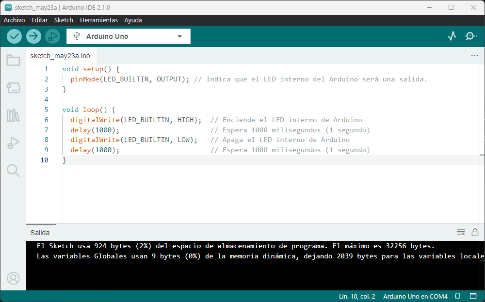 Enciende el Arduino y verás cómo el LED incorporado parpadea, alternando entre encendido y apagado con un intervalo de 1 segundo.