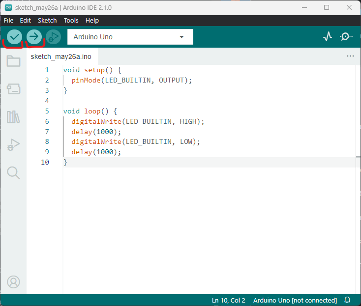 Haz clic en el botón que tiene una flecha en la esquina superior izquierda. Este botón revisará primero que todo tu código este correcto, y luego cargará el código en tu Arduino.