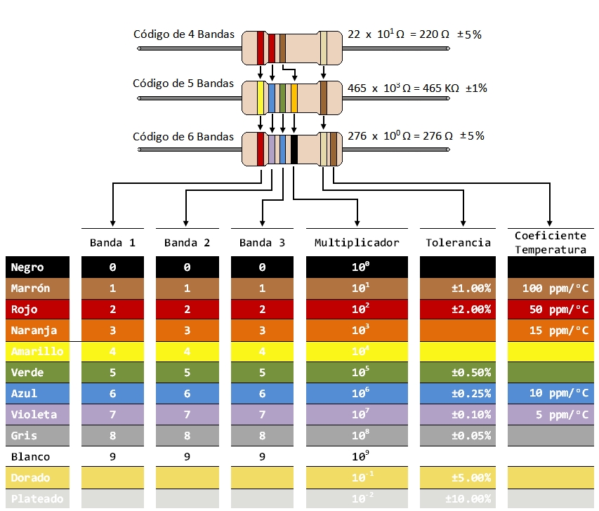 En las resistencias, generalmente encontramos bandas de colores que representan su valor. Cada color tiene un valor numérico asignado y una tolerancia. El valor de una resistencia se expresa en ohmios (Ω) y se determina por la combinación de colores en las bandas de la resistencia. La tolerancia indica el rango de variación permitido para el valor nominal de la resistencia.
